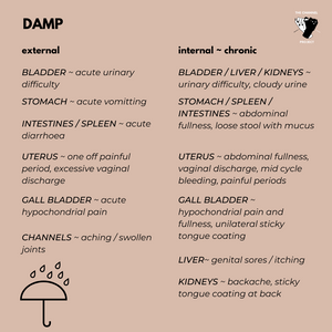 Damp, when an internal pathogen, is considered to be formed by the Spleen not transforming and transporting and it can be particularly exacerbated by a sedentary lifestyle and a diet which injures Yang.